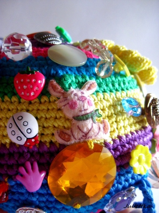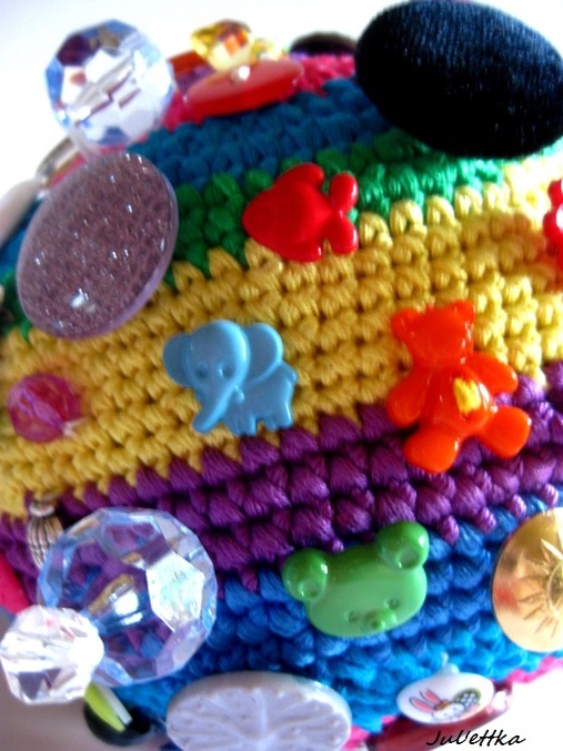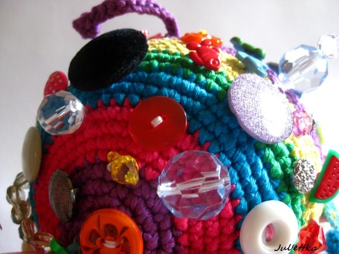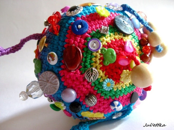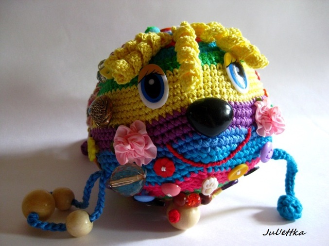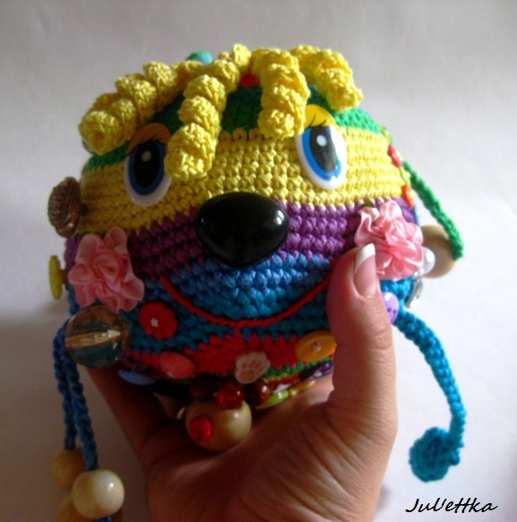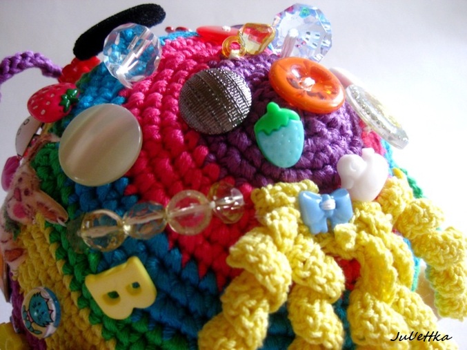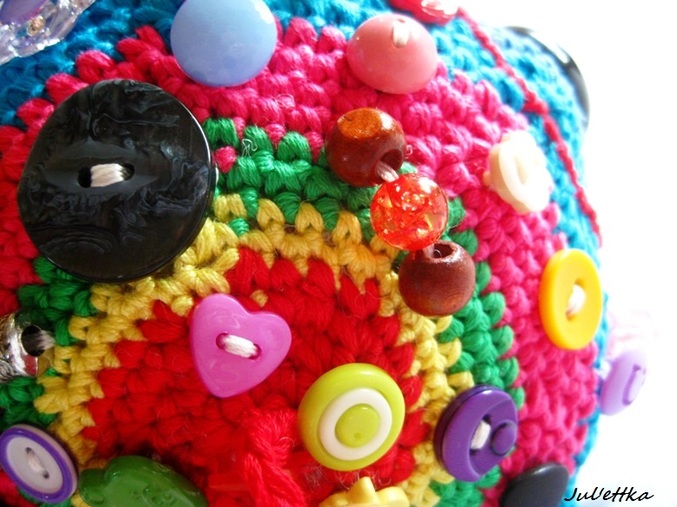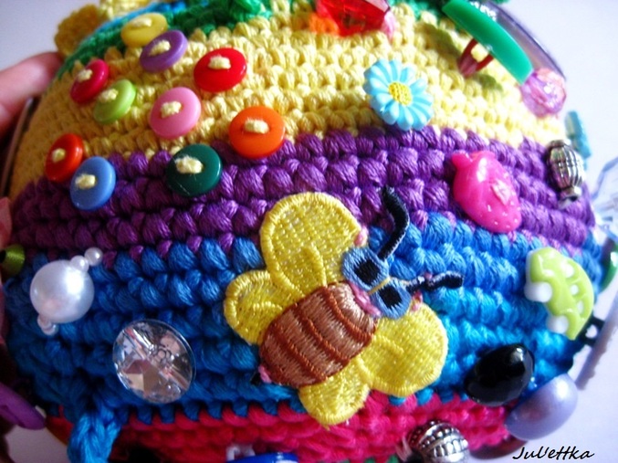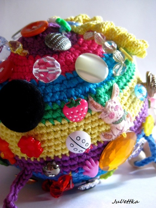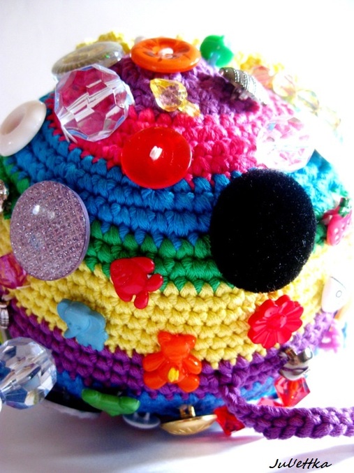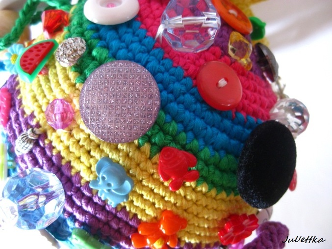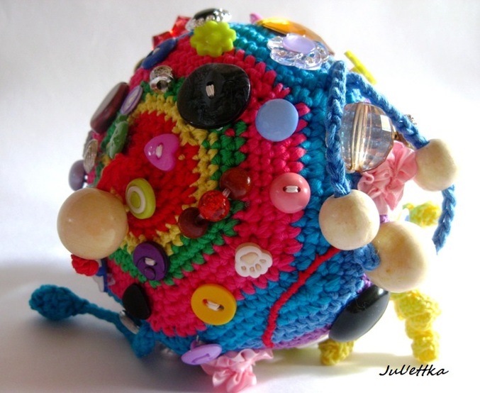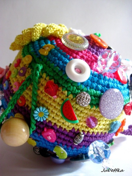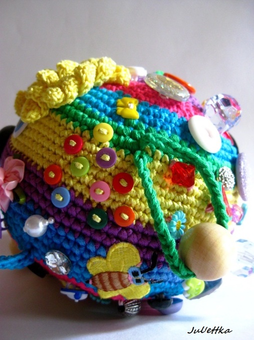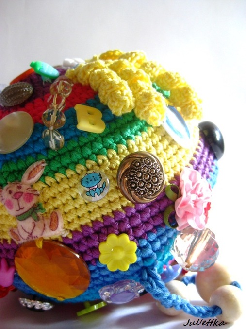 Знакомьтесь с озорным шариком-развивашкой Пуговичкиным. Связан из яркого очень толстого хлопка (пехорка Подснежник 110м/100гр.) Для создания этого замесательного шара ушло более 100 пуговиц и бусин (около 110-так и не смогла пересчитать точнее), 3 объемные аппликации (заяц и две щечки-цветочки)+1 плоская пчелка, яркие глазки, носик, ротик вышит мулине, челочка связана из пряжи вита роз, внутри шара погремушка, набит синтепоном .Пуговицы очень прочно пришиты капроновыми нитками и местами ирисом. Многообразие пуговичек и бусин освободит маму на некоторое время от требовательного малыша))) Пуговички использованы:рельефные,яркие детские, с блестками...даже есть очень приятная мягенькая плюшевая пуговичка. Сделаны и веревочки с деревянными бусинами,которые можно "муслякать". Играть игрушкой только в присутствии родителей.