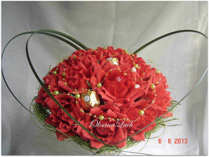 Мне тоже сразу в глаза феррерки бросаются, а потом радуют глаз прекрасные розы ) Сердце нравится, большое и открытое для любви ) А как раффаэлки крепятся? Мне удобнее в пищевую пленку и на проволочку. С клеем подольше почему-то получалось. Кругленькие все равно удобнее)