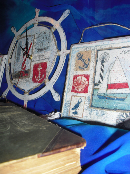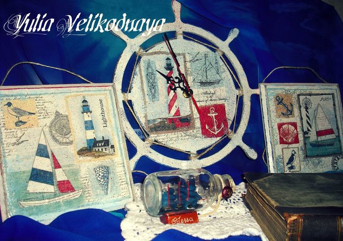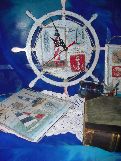 потрясающе. очень изысканно. такое редко увидишь, всё больше аляпистость какая-то. часы поразили в самое сердце. недавно видела в похожем стиле работы с маяками в одной из групп по декупажу - очень понравилось тоже, еще и как состарены деревянные рамки