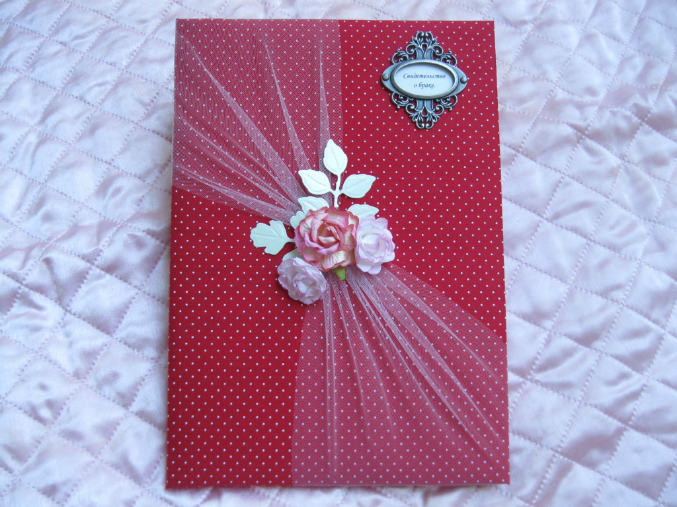 Папка для свидетельства о браке изготовлено из яркого 100% хлопка с гороховым принтом на синтипоне.