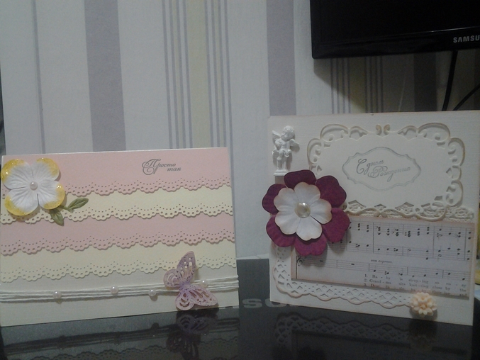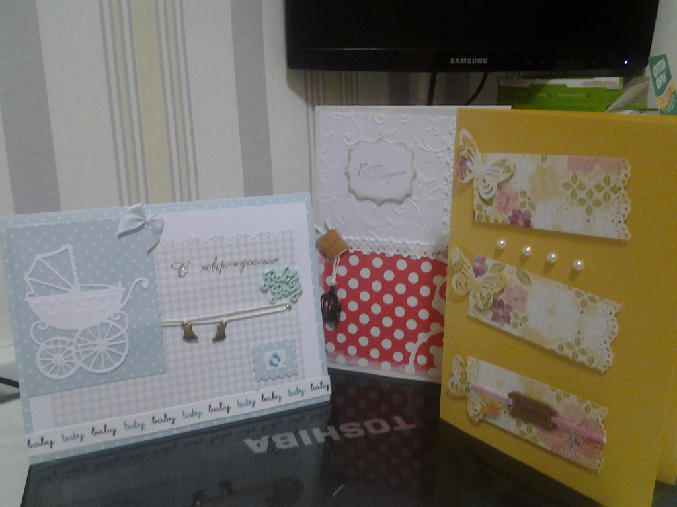 а эт, все мои открытки)))) подружки, разбирайте кому какую. первая в подарок от меня) у всех внутреннего оформления пока нет - сделаю с учетом индивидуальных пожеланий. единственное что, открытку "с новорожденным" пока попридержу. у мужа племянник родился,ждем когда позовкт, если так и не позовут, тоже подарю кому-нить другому.
