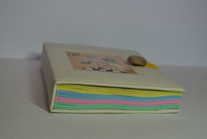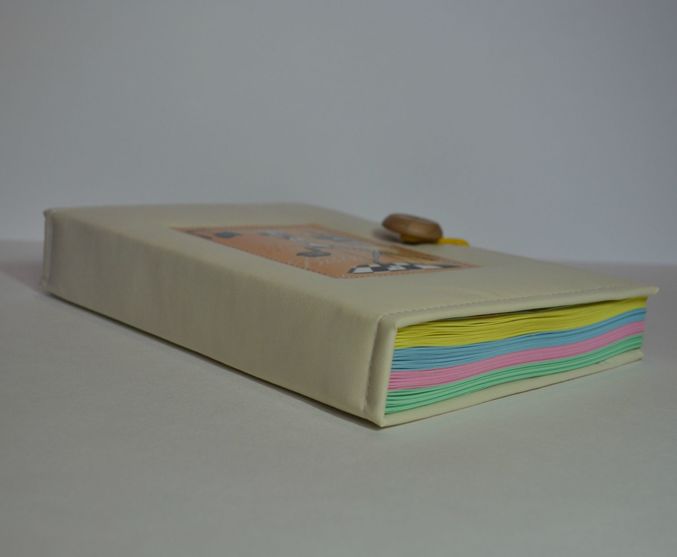 Формат А5, 200 листов. Закрывается на пуговку-резинку. Обложка- искусственная кожа, проложнена синтепоном.