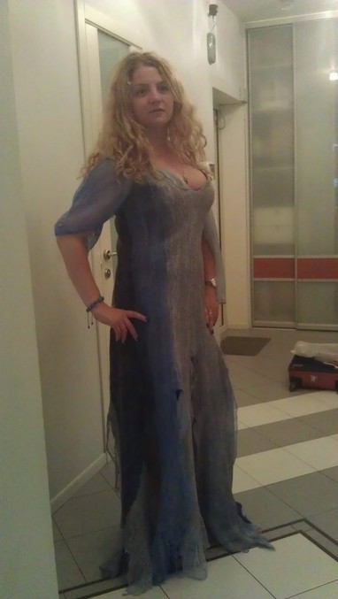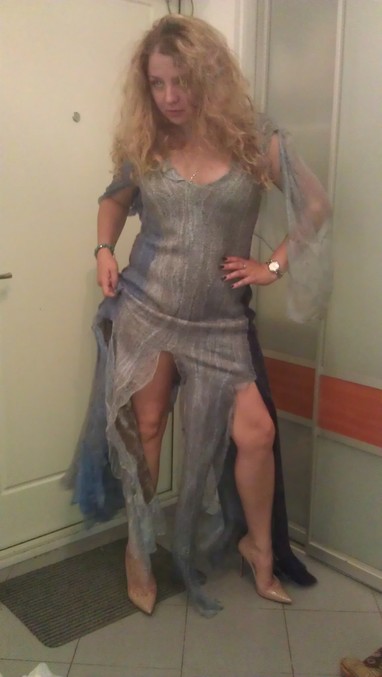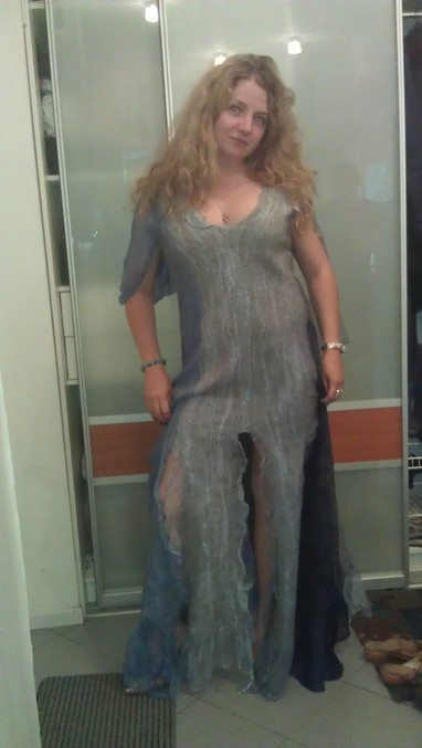 Фелтинг (валяние шерсти)Делала в обмен на оплату МШ Ирины Левкович по платью. Сегодня подруга-заказчица приехала примерять, ей понравилось, даже отказалась подрезать подол под туфли) Сразу скажу, что девушка 73 кг/168 см/бёдра 107 см, талия 87 (чтобы вы могли оценить, полнит оно её или нет. По традиции зафиксирую явные "косяки": над тонкой раскладкой ещё работать и работать - чтобы привести в нужные размеры более толстую раскладку понадобилось 3 дня попотеть; "шиворот" сел не идеально (моя ошибка в выкройке), учту. Айфонфото с первой примерки (она же единственная). PS на 8-м месяце валять нереально тяжко, приостановлюсь на пару месяцев (впереди ещё ПКС). До Ирины мне как до Китая, но я всё равно получила удовольствие от нового опыта)))