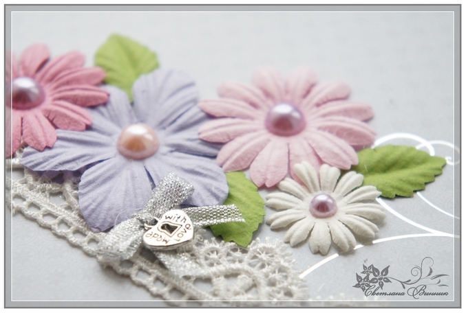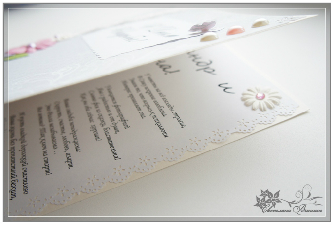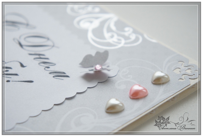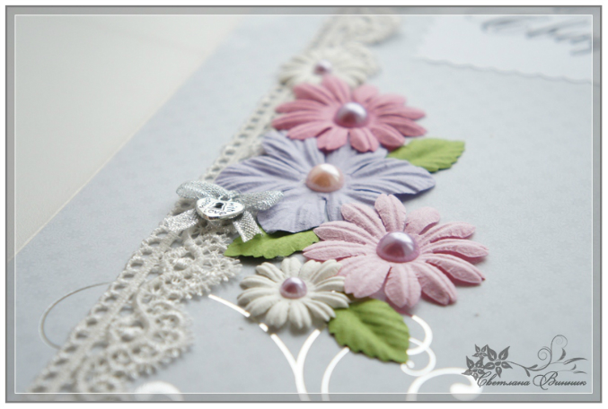 Попросили сделать свадебную открытку (формат А4). Так как я делаю ещё первые неуверенные шаги в скрапе, то многого ещё не имею в наличии. Надпись "С Днём свадьбы" планировала сделать по-другому, но ограничили по времени. Критика приветствуется.