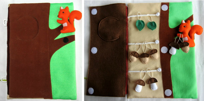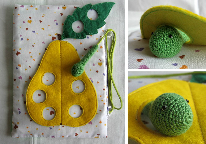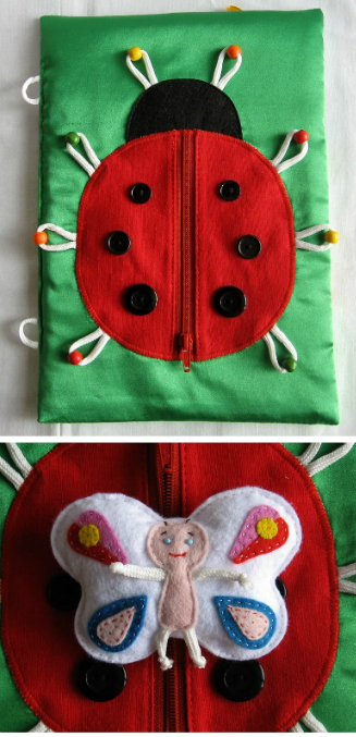 3 страничка - божья коровка - на ножках-усиках ищем пары - подбираем бусинки по цвету, растегиваем-застеиваем молнию на спинке жучка. У божьей коровки есть пассажир - бабочка, которая может быть использована как самостоятельная игрушка.