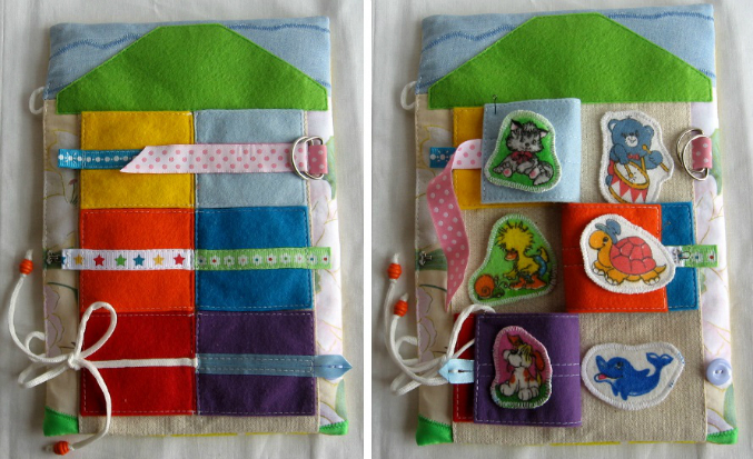 5 страничка. Домик с 6-ю дверьми, которые закрываются на разные застежки (кнопка, липучка, полукольца, пуговка, шнурочек, крючок).