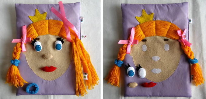 2 страничка - капризная принцесска со съемными частями лица для изучения. Также учимся завязывать бантики, плести косички и надевать резиночки для волос.