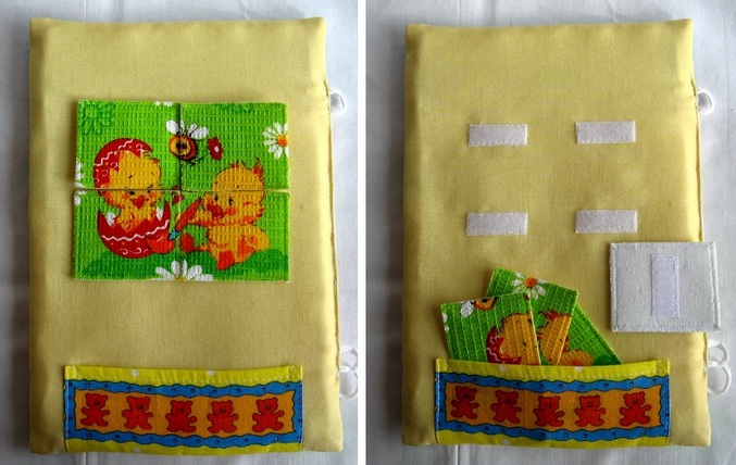 Первая страничка-обложка с кармашком-скорлупкой и цыпленком в нем. Цыпленок вынимается и представляет самостоятельную игрушку.