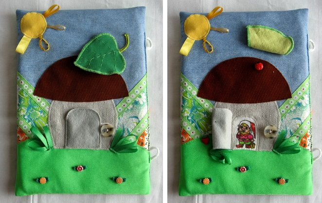 4 страничка. Домок-грибок с жителем-гномиком, который прячется за дверкой. Под листиковм, на шляпке, сидит божья коровка. В травке, около домика, спряталась ягодка. В солнышко вшита пулька - толкать пальчиком.