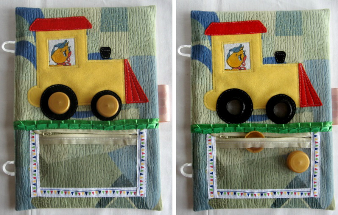 9 страничка. Паровозик с накручивающимися колесами. Травка сделана из атласной ленты.