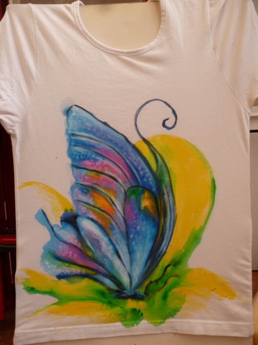 Роспись по ткани, батикБыла белая футболка, но с ребенком белое - это опасно))), я уж не помню чем обрызгал - но пятна не отстирывались, как будто чаем капнула, ну и решила рисунок нанести, процесс очень понравился, с акрилками работать одно удовольствие, моя первая графика на ткани