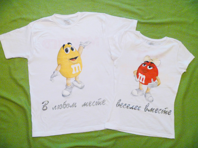 Роспись по ткани, батикФутболочки для молодоженов с яркими героями m&ms, на футболочках красный заменен на приятную девушку того же цвета))) На спине надпись "Молодожены"