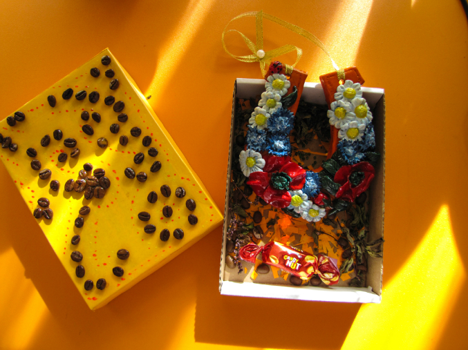 Фото 5 упаковка.Немного кофе и сушеной мяты в коробочке...на дне бисер зеленый с оранжевой бумагой...ну и конфетка)))