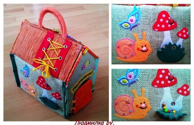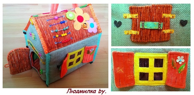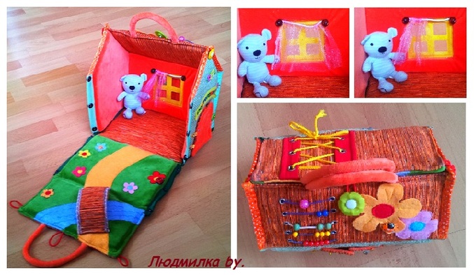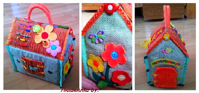 Исполнилось моей любимой племяшке Лизоньке 2 годика и сшила я для неё вот такой домик-сумку. Развивающими элементами сильно не заморачивалась, так как девочка уже не маленькая))), но кое-какие интересности в нём конечно же есть)