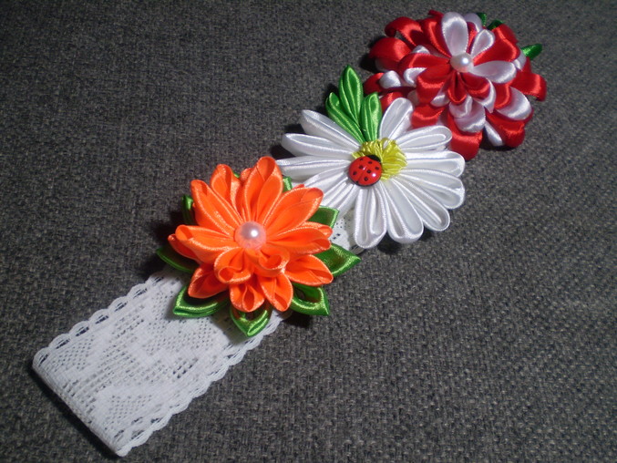 Попросила меня знакомая сделать повязку для девчушки. Долго уговаривала я её выбрать вариант с одинаковыми цветами. Однако, клиент был непреклонен - все цветы должны быть разные и как можно ярче))) В пожеланиях была еще бабочка, но её просто уже некуда садить