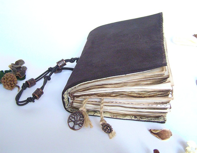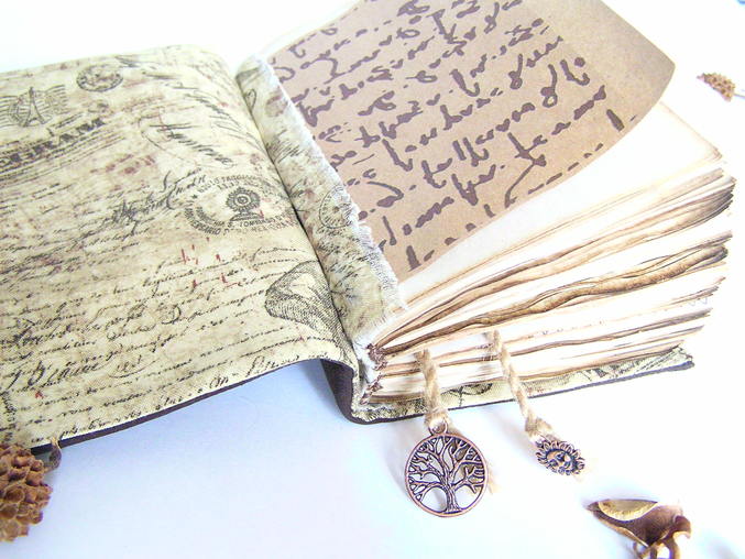 СкрапбукингВнешняя сторона обложки выполнена из натуральной кожи высочайшего качества (производство Италия). Внутренняя сторона обложки - ткань. Листы искусственно состарены, тонированы, ароматизированы кофе с корицей, края листов дополнительно тонированы огнем. Книга частично проштампована. Содержит две закладки из льняных нитей с подвесками, также разделена на несколько частей листами крафт бумаги. Имеет два кармашка из плотной бумаги, листы с кармашками прошиты, тонированы чернилами. Блок собран и переплетен вручную. Закрывается на резинку декорированную бусинами. Формат А6.