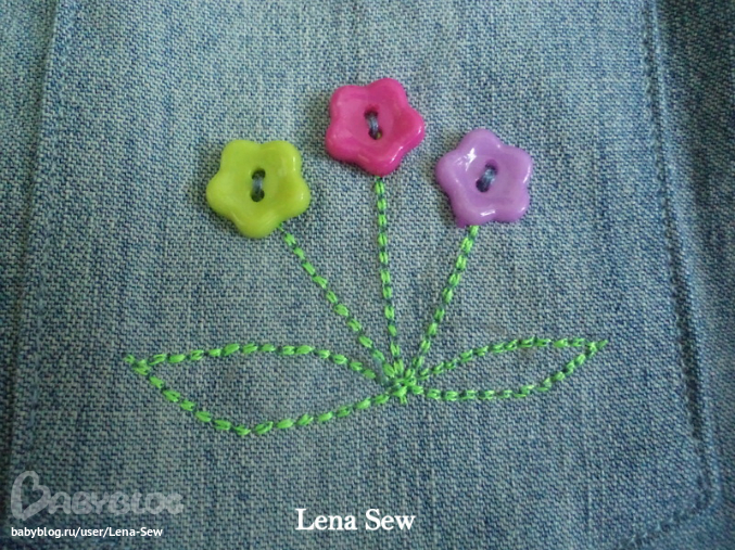 Украшала декоративной строчкой для трикотажа, нить заправляла вискозную. Пришила 19 декоративных пуговиц)