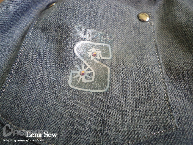 Декор термотрансферы, термостразы, клепки и отстрочка металлической нитью.