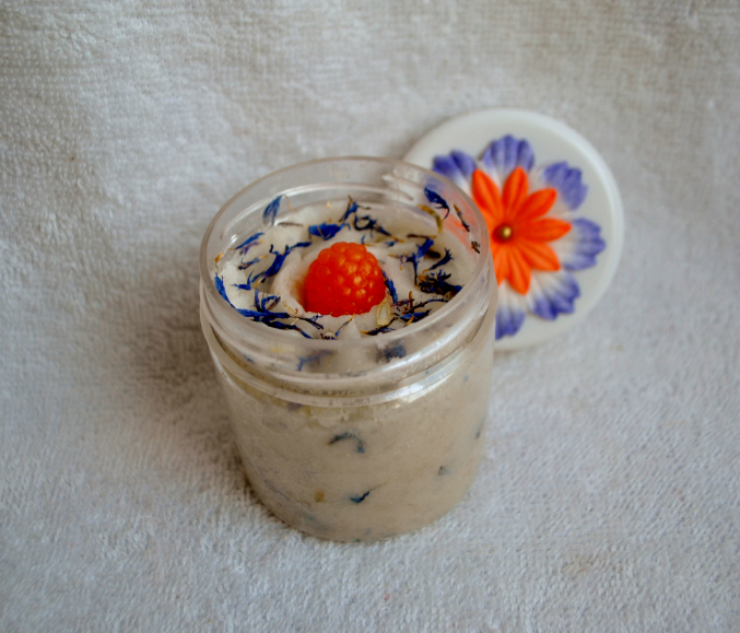 Состав: профессиональная кремообразная основа, соль морская, люфа измельченная в волокнах, масла виноградной косточки, миндаля, макадамии, мыльная стружка из собственноручно сваренного мыла с нуля, лепестки василька, эфирные масла.
