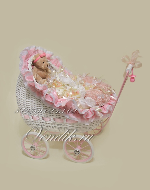 Сегодня я хочу показать своё новое творение - беби букет из детской одежды в плетёной ретро колясочке, который сделала на заказ для новорожденной девочки. Вы бы видели, какие вещички уложены в эту коляску....ммм....