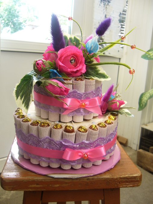 Необычно использование кружева, и цветовое сочетание очень необычно. Соглашусь по повода низа работы (подставка очень упрощает вид и конфетки не очень ровно в первом ряду стоят). А так - замечательный, свежий торт!