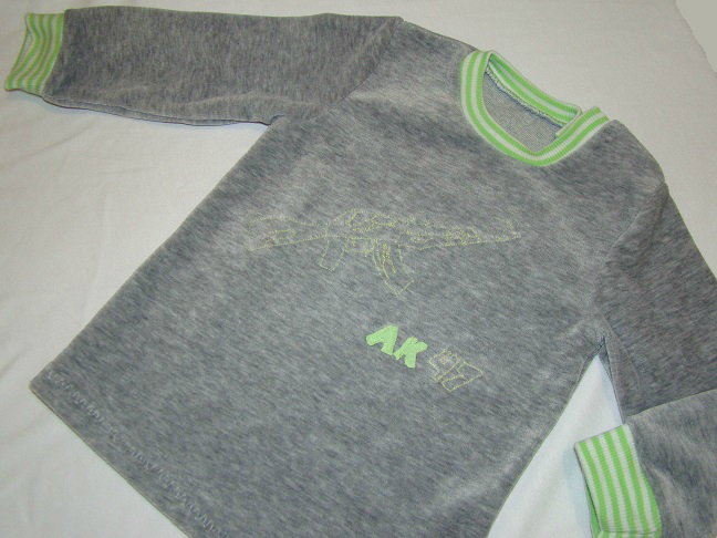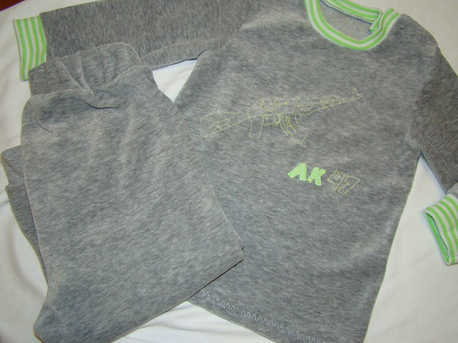 Второй костюмчик, цвет серый меланж. На штанах манжеты из рибаны, а на кофте веселенькая отделка из кашкорсе в полоску. На плече предполагаются кнопки.