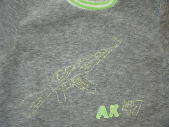 Декор - вышивка. Это совместное с мужем творчество)) он рисовал, я вышивала. Вышивала - это, конечно, громко сказано))) Приложила и зафиксировала рисунок, прошила по контуру, бумагу убрала. Получилось не очень ярко, но старший сын сразу определил, что это автомат, и затребовал себе такой же))