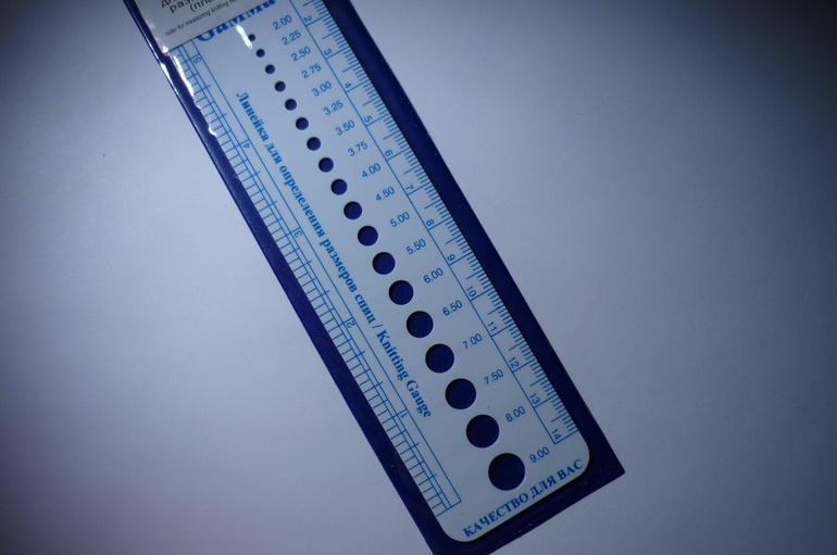 Линейка из пластика. При помощи этой линейки можно легко определить диаметр спиц, а также плотность вязания полотна на линейке нанесена размерная шкала в см. и дюймах.