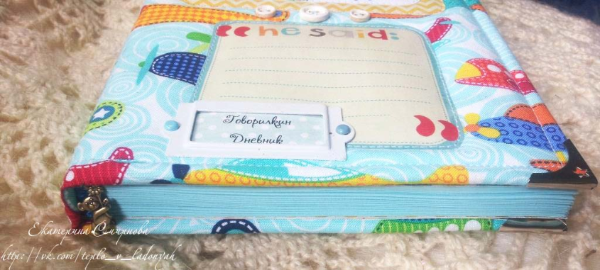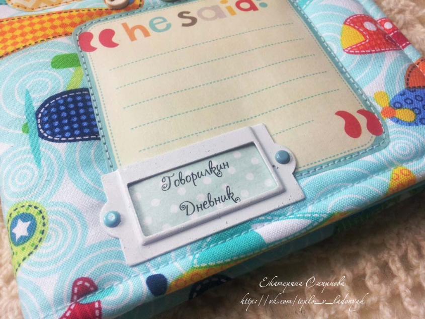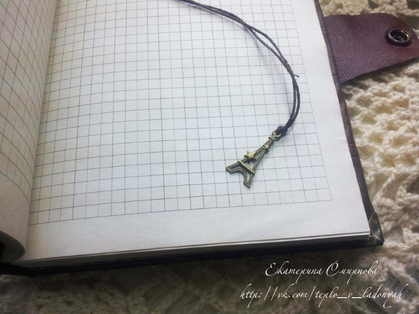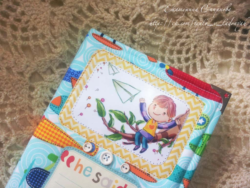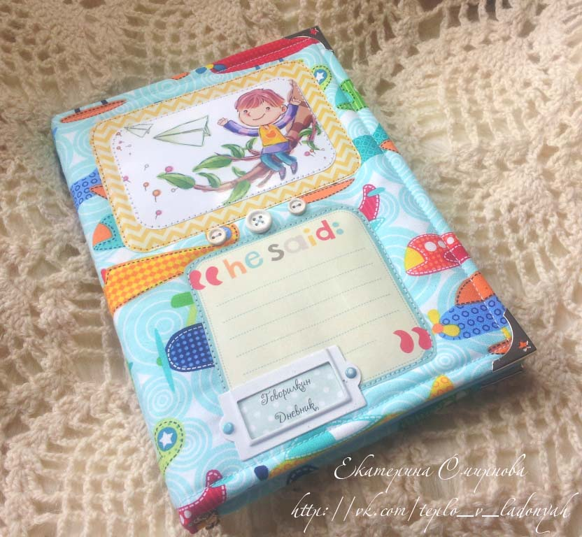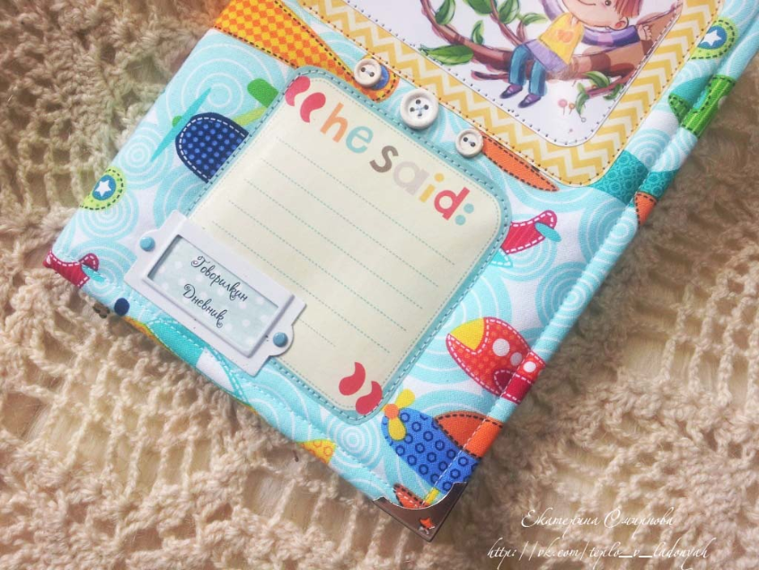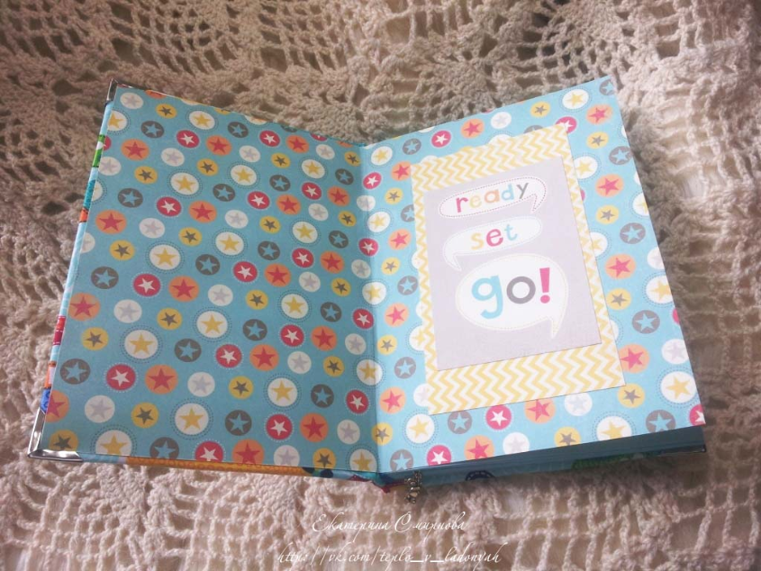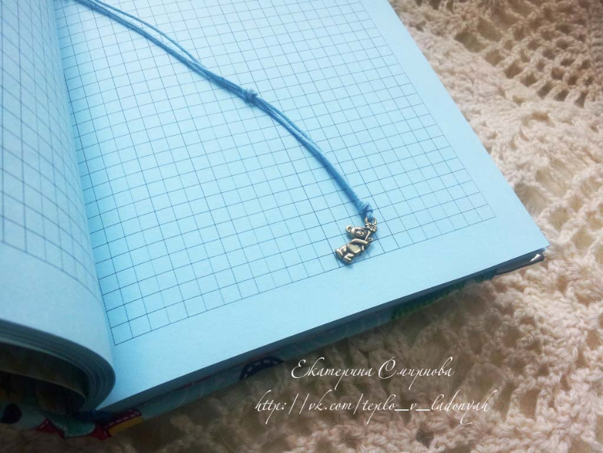Формат А5, обложка мягкая, обтянута хлопком, внутри 80 голубеньких листочков в клетку. Металлическая фурнитура, скрапбумага, распечатки, пуговки. Закладка - вощеный шнур с подвеской.