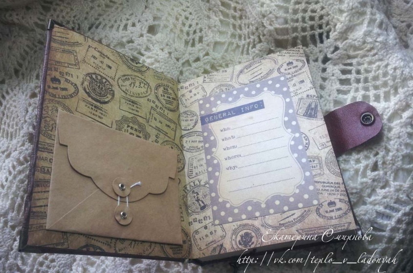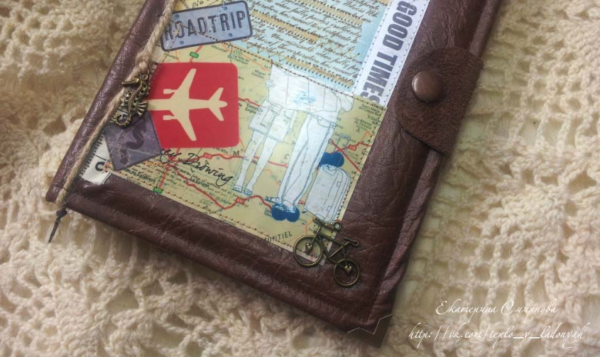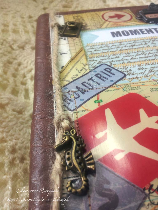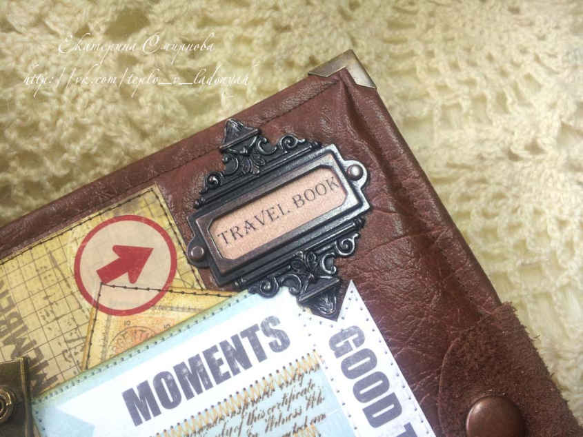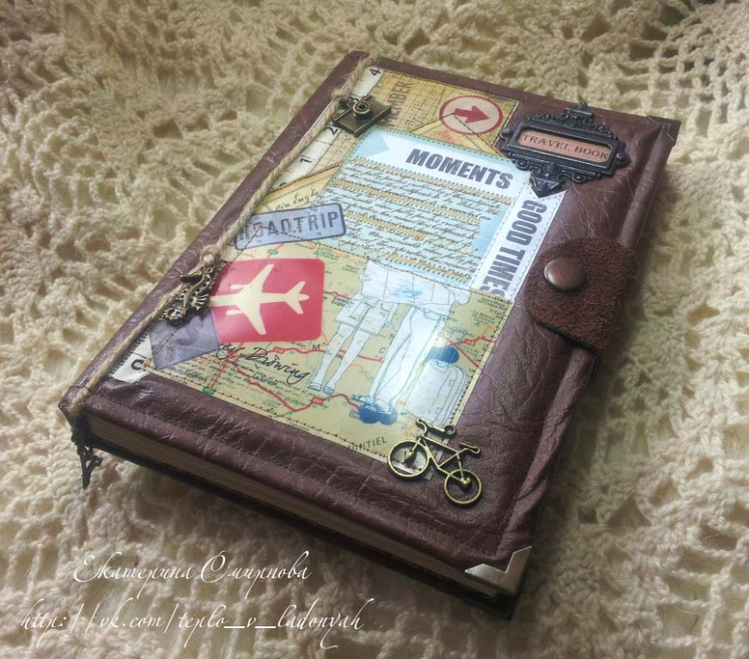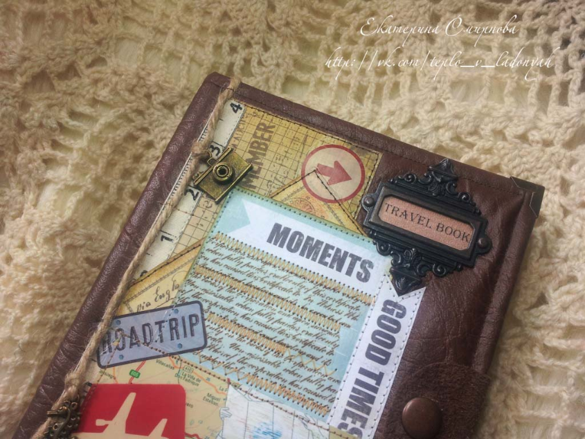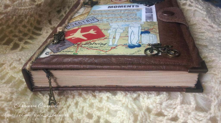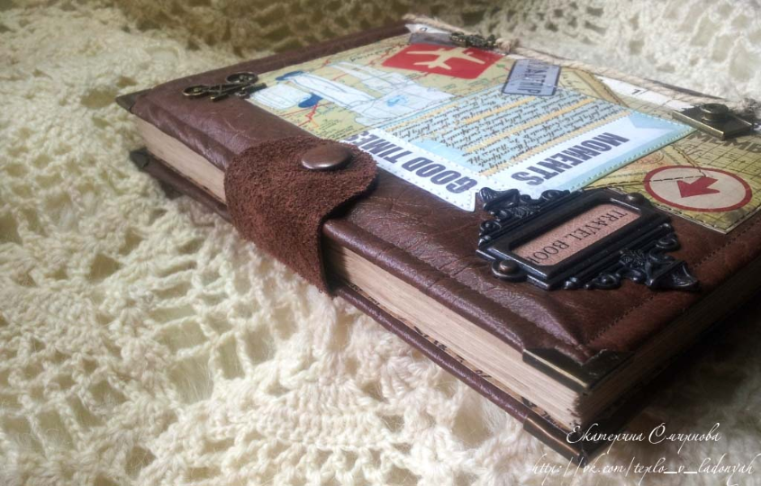 Значит Тревел-бук) Формат А5, обложка мягкая, обтянута кожзамом, внутри 100 состаренных листочков в клетку. Металлическая фурнитура, скрапбумага, распечатки, натирки. НА переднем форзаце кармашек для памятных вещичек)) Закрывается на кожаный хлястик на кнопку. Закладка - вощеный шнур с подвеской.