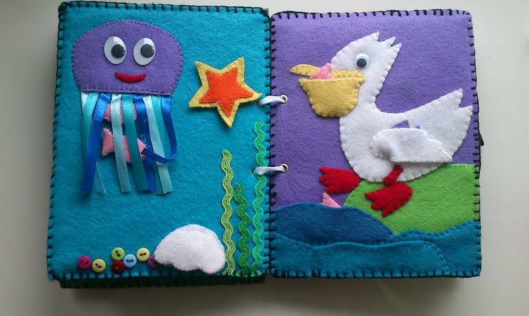 Следующий разворот на морскую тематику. Здесь страничка с морскими жителями. Щупальцы медузы слегка потрепаны, т.к. это долгое время была любимая страничка. Звезда на липучке, рыбки на кнопках. В ракушке жемчужиСледующий разворот на морскую тематику. Здесь страничка с морскими жителями. Щупальцы медузы слегка потрепаны, т.к. это долгое время была любимая страничка. Звезда на липучке, рыбки на кнопках. В ракушке жемчужина.