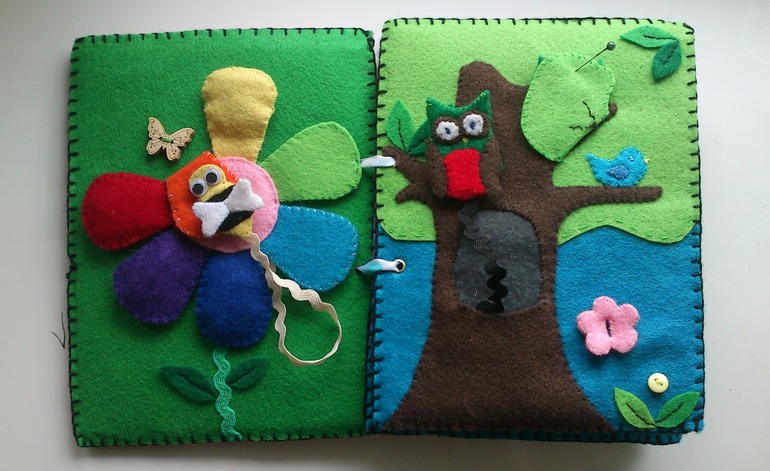 На втором развороте у нас цветик-семицветик с пчелкой и дерево с совой.