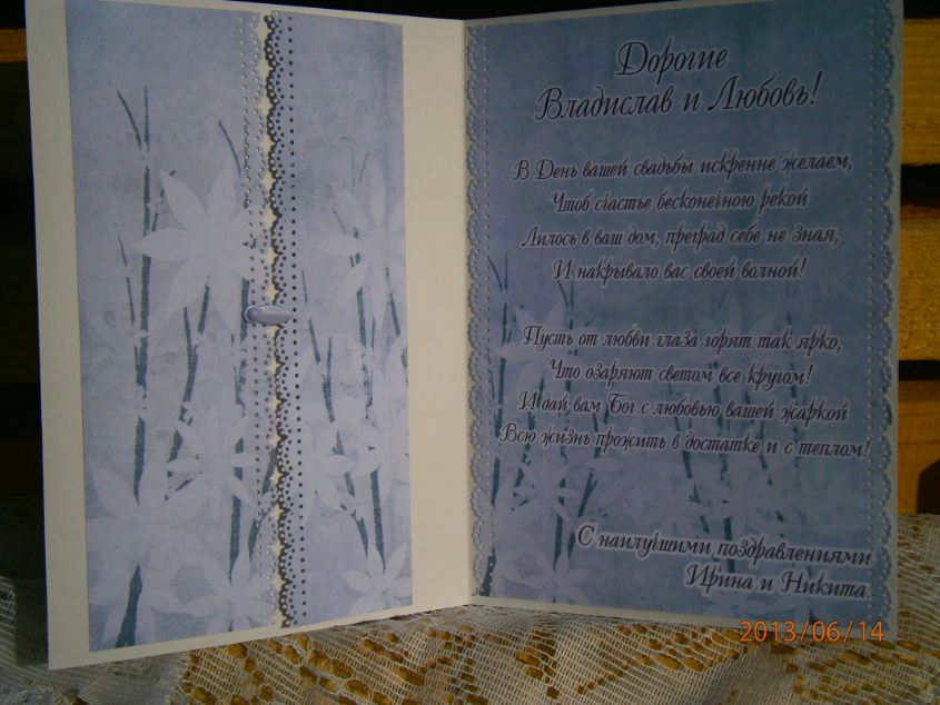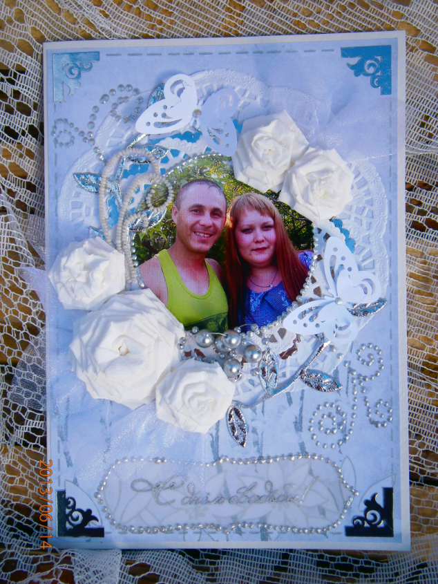 Как всегда фото ставятся не по порядку.... Это еще одна свадебная открытка. Первый раз делала с фото. Правда жених с невестой не при параде, но эта открытка для них сюрприз, поэтому фото лучше просить не стали..