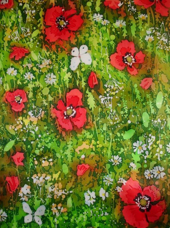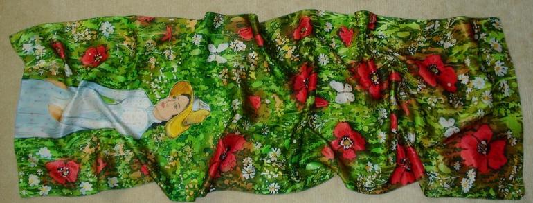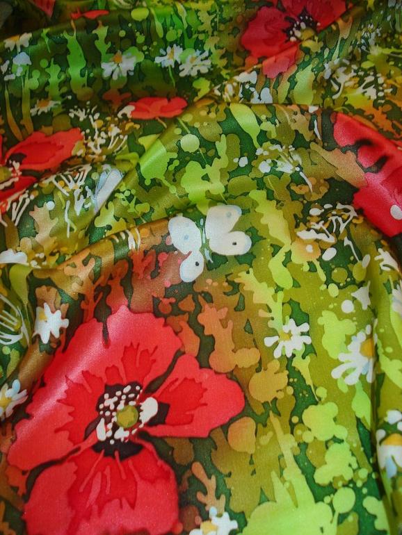 Рисунок сделан на нежном переливающемся атласе средней плотности, профессиональные красители оставляют шелк мягким и легким.