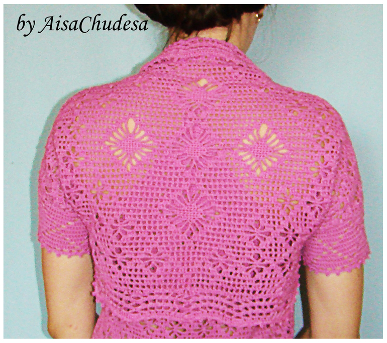 узор на данном прямоуголнике(основном) у меня не был завершен, так что внизу был дополнен еще рапортом паучков от швов (где у нас рукава), по бокам делая убавки, чтоб смотрелась более аккуратно и при обвязке все было гармонично.