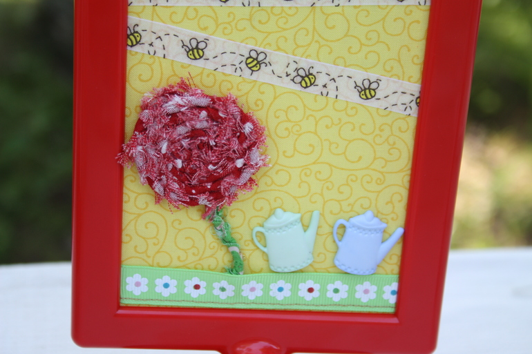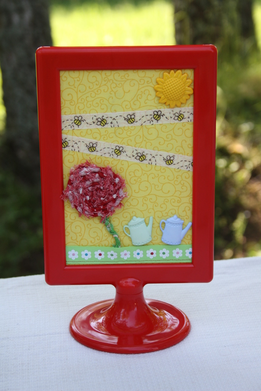 Основа хлопковая ткань, натянутая на тонкий пластик. Цветок скручен из ткани, декорировано лентами и пуговичками. С обратной стороны почтовая карточка.