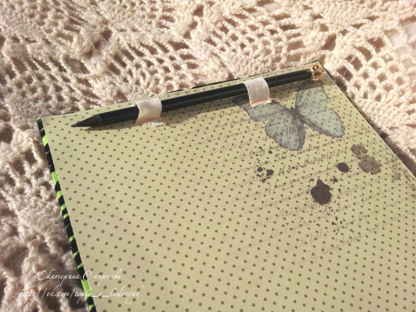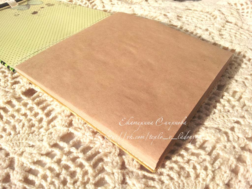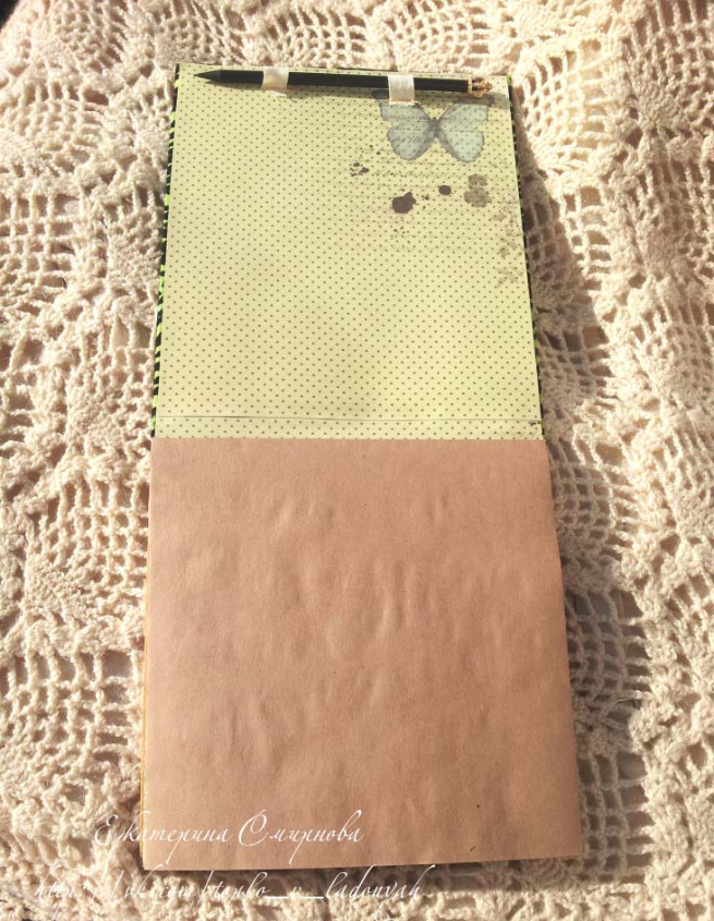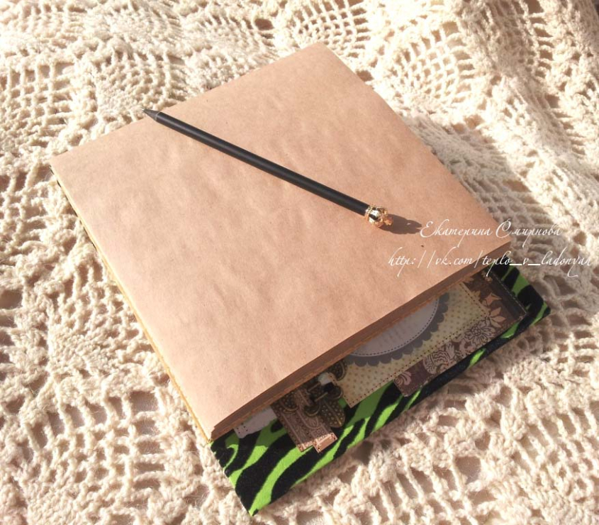 Сверху скрапбумага. Внутри 40 листов крафт-бумаги. На переднем форзаце петельки для карандаша или маркера.