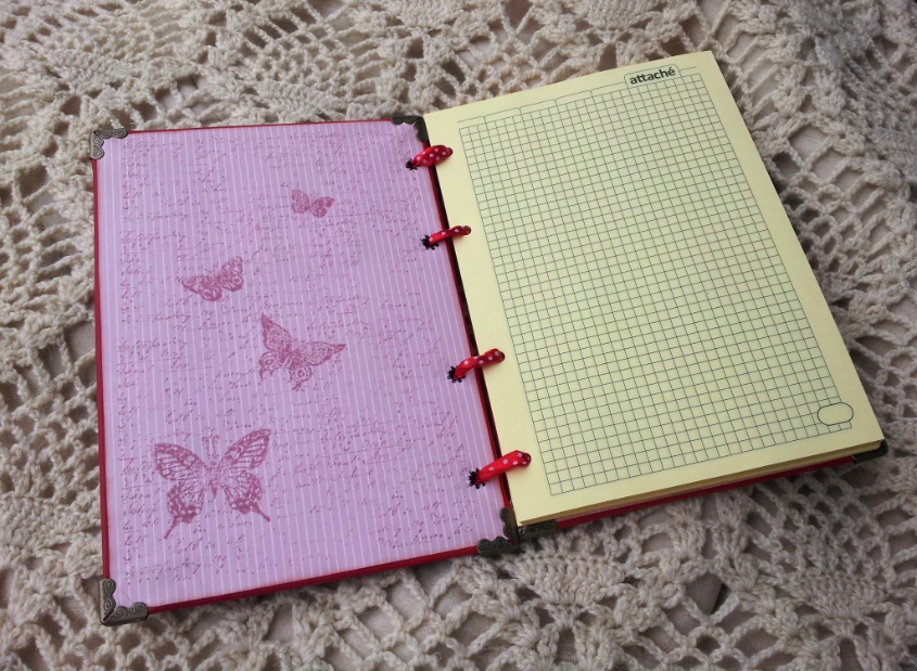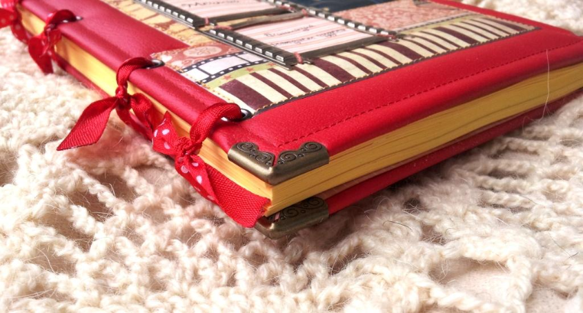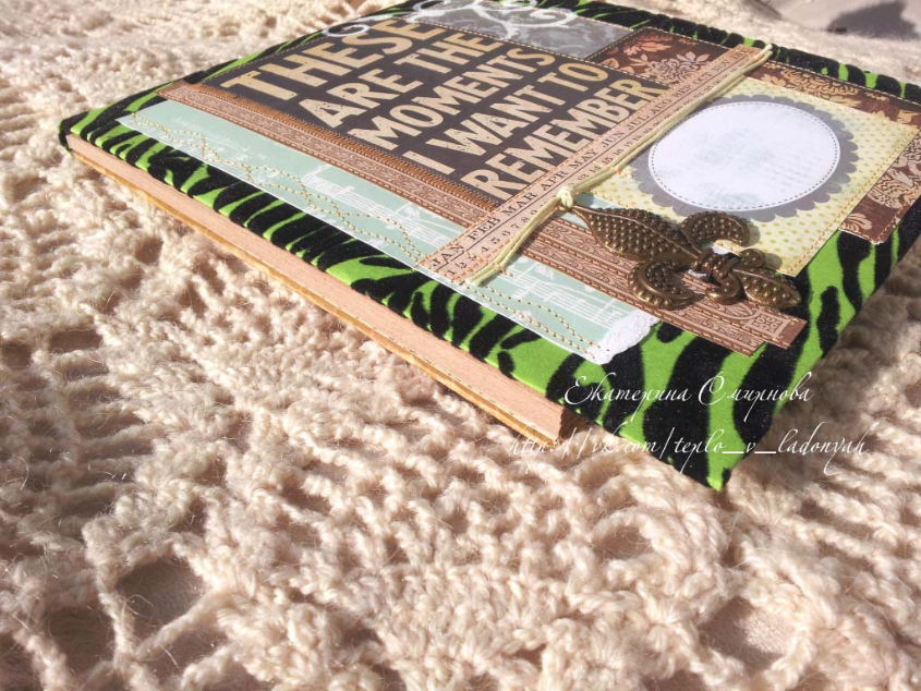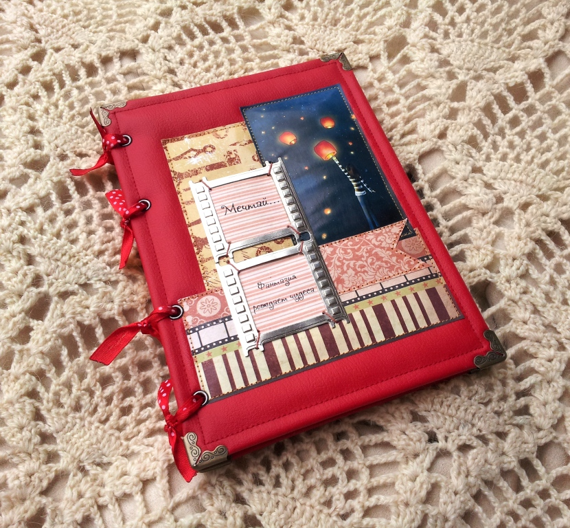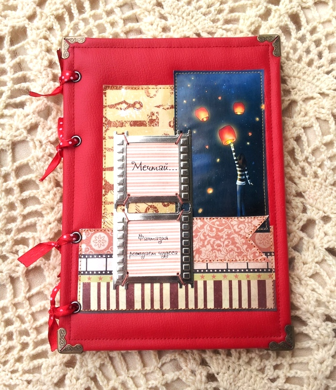 Сделала просто так, за вечер)))) Формат А5, обложка мягкая, обтянута кожзамом. Переплет - на лентах. Металлическая фурнитура, распечатка, скрапбумага. Внутри 80 желтых листочков в клетку (готовый блок).