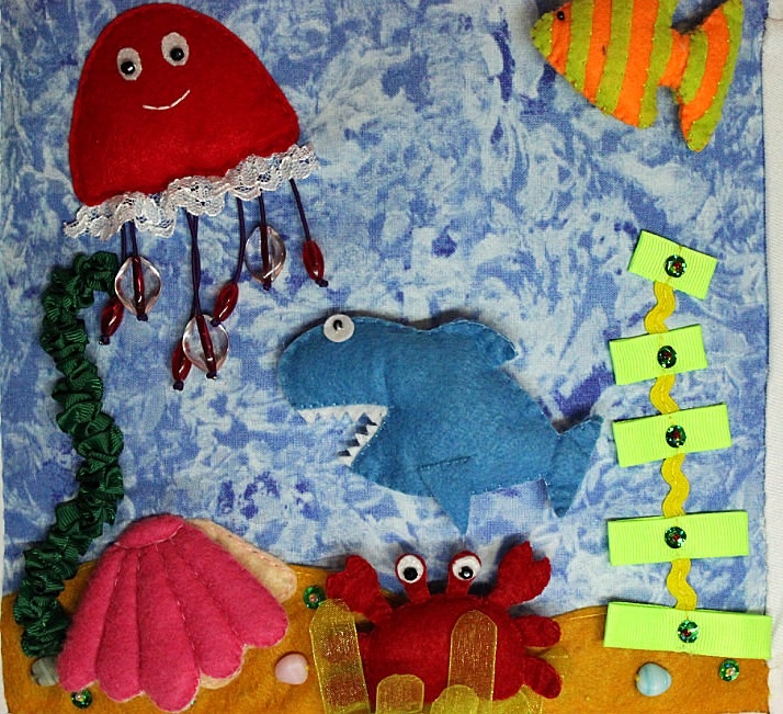 В море плавает медуза. Щупальца у медузы на резинке. Рыбка на кнопке. Акула на липучке.