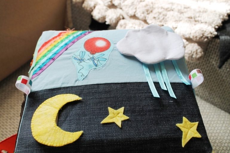 Тут в принципе все понятно луна, тучка и солнце на липучках, дождинки прячутся в тучку.