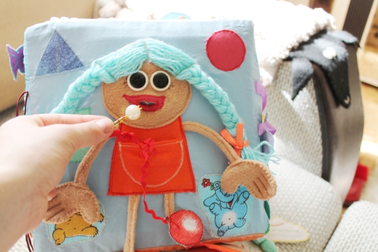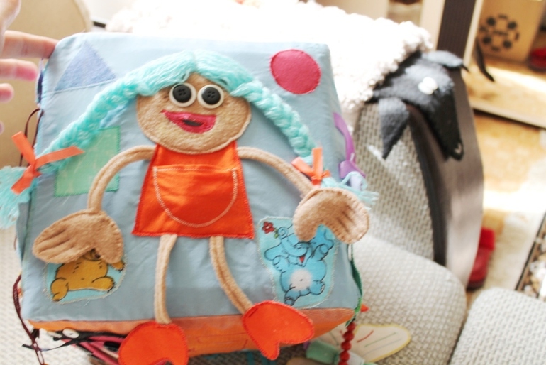 Долго лопатила весь интернет в поисках идей сначала для развивающего коврика, потом решила шить книжку и в итоге получился кубик, решалась на начало работы где-то месяца три. Сшит из остатков тканей, докупала только пуговки, ленточки и поролон, все остальное нашла дома. Кубик получился большой 23*23 см. И вот через три недели неспешной работы он завершен: