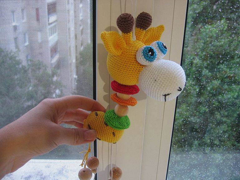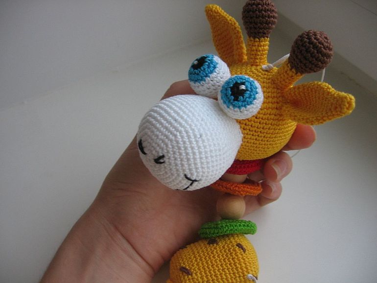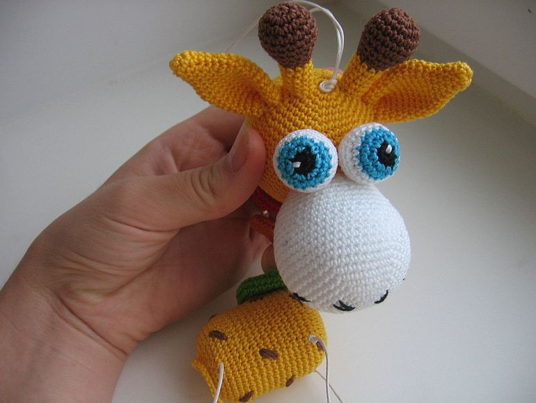 жирафик мой авторский, вяжу на глаз и честно говоря не смогу точно сказать как) тело - обвязанный киндер, голова - шарик от погремушки. Ну а все остальное на глаз