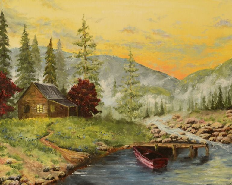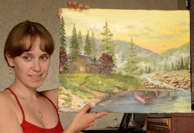 Вольная копия картины Томаса Кинкейда. У него такие волшебные картины, в каждой игра света - солнечные блики и лучи, вплетенные в полотно :) .. так и захотелось себе что-то подобное. Правда получилось не совсем то, но в целом я довольна :) Вот, муж запечатлел, только-толкьо краску от рук отмыла)))