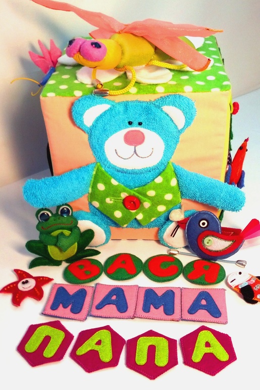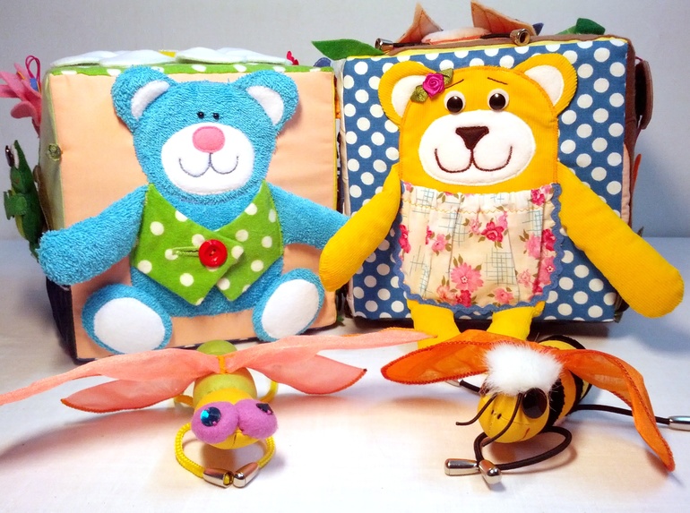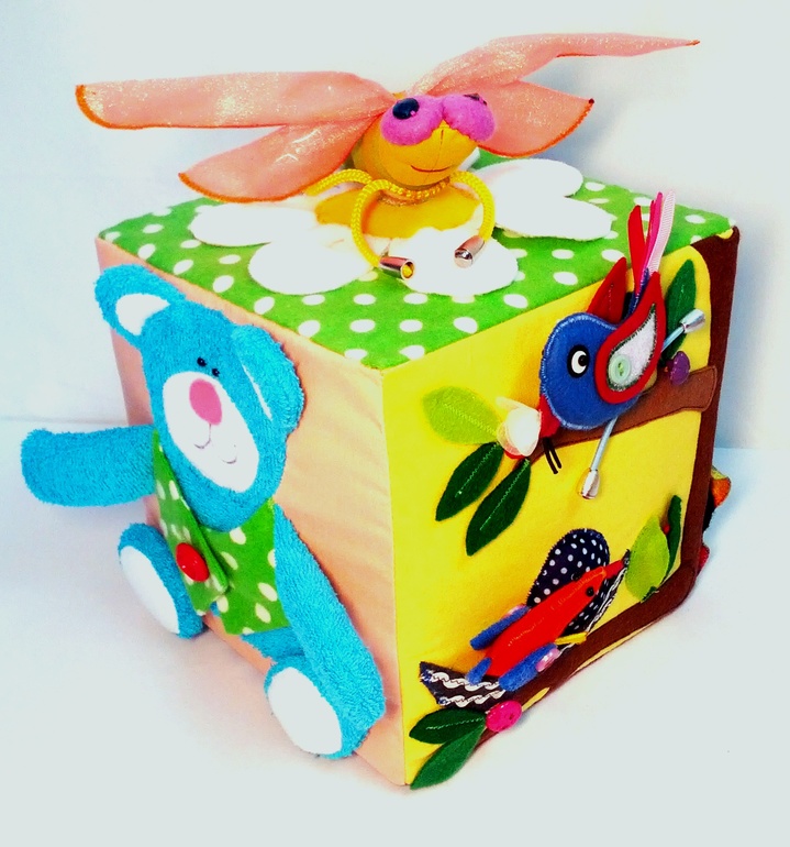 Птичка - погремушка на липучке, лапки перетягиваются. Птенчик на резинке, пищит. Яичко в гнезде шуршит. В листьях спряталась бабочка.