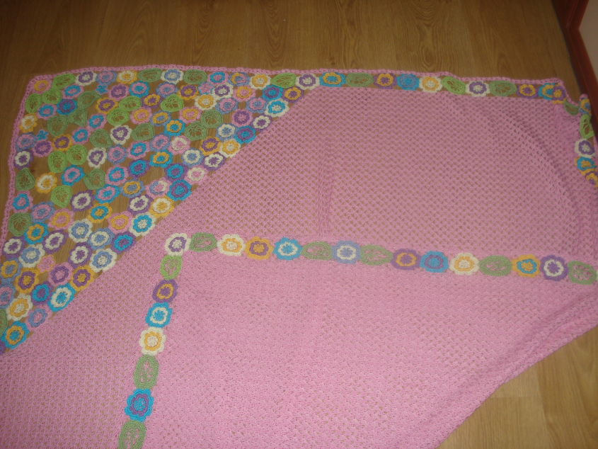 Долго и упорно вязала плед для новорожденной девочки. Получился 1,5 метра на 1,5 метра. Уголок и кайма выложен цветами , которые вязались отдельно и потом собирались. Взяла за работу 5 000 рублей . Не много ли !!! Что скажете!!! Извините фото не очень. Ниточки Ализе виолет.