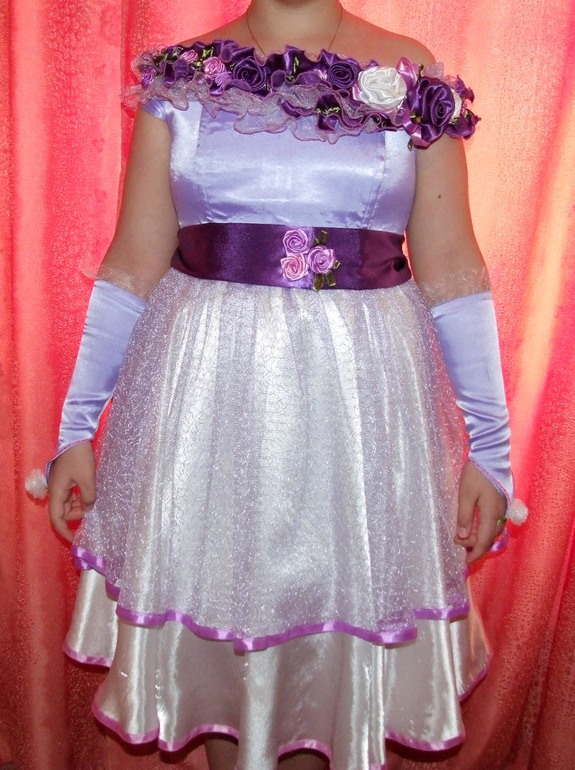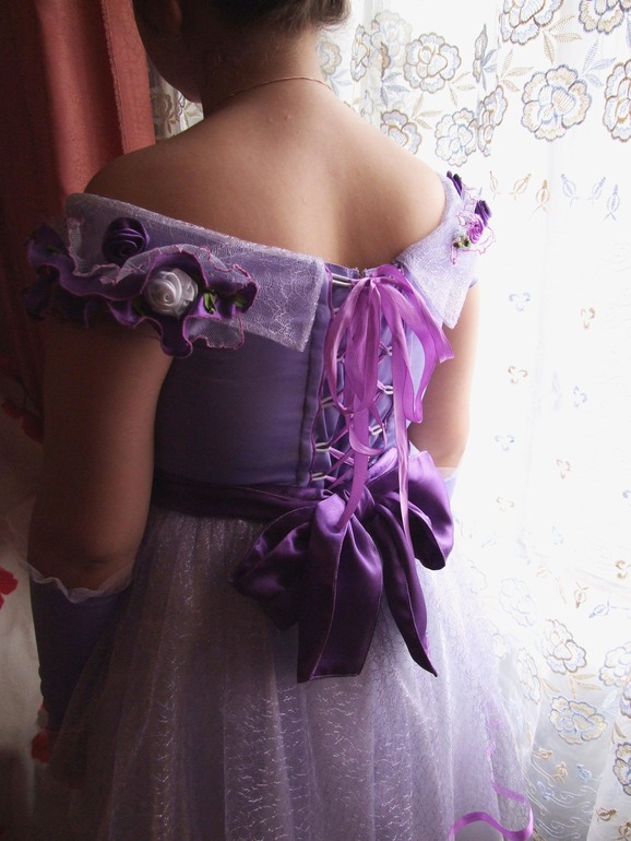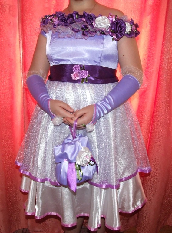 Юбка солнце, отделка цветами из ткани, на спинке корсетная шнуровка, ткань стреч-атлас, атлас и гипюр, нижняя юбка из сетки. В комплекте сумочка и перчатки. Шила год назад, в этом году оно было нам уже безнадежно мало... Может, кому надо - отдам дешевле стоимости ткани (у меня на ткань ушло 2600 руб.)