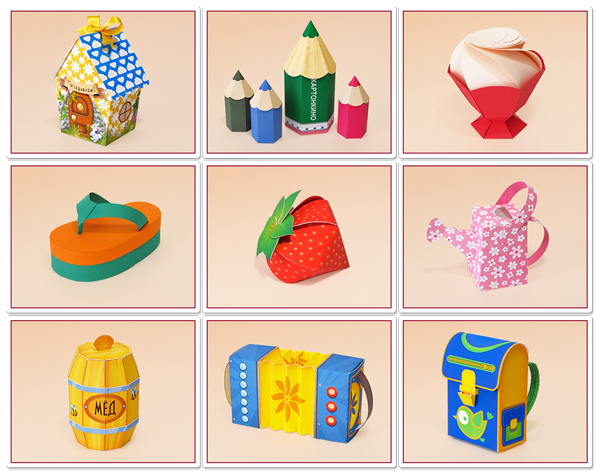 В наборе - 30 моделей удивительных коробочек, которые приведут в восторг любого ребенка. Для каждой модели подготовлены качественные развёртки в форматах PDF и PSD, а также пошаговые фото-инструкции.