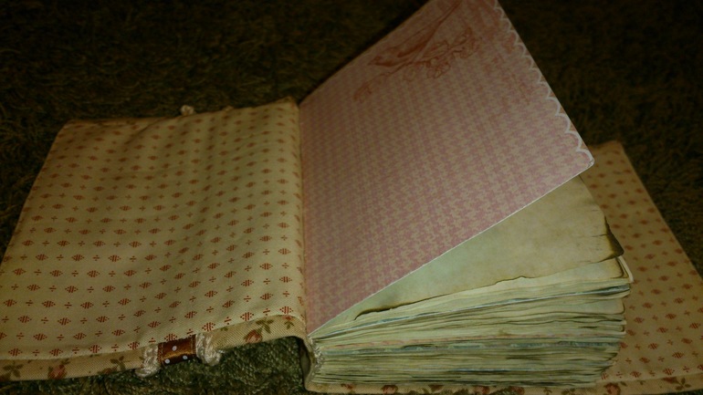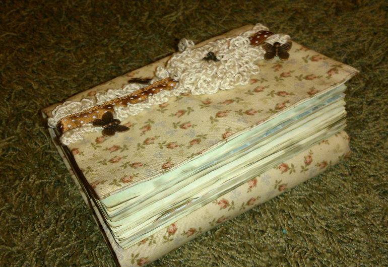 - Блокнотик формата А6, декорирован ручным кружевом и цветком. 130 тонированных листочка. Украшено подвесками бабочками.