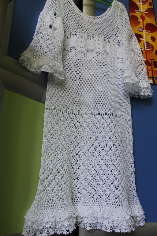 Вот связала платье подруге, пришлось немного повозиться)) У нее большая грудь, а лопатки сзади сведены так, что спинка почти на 20% уже (она всю одежду вшивает на спинке), благо, что она работает недалеко от меня и бегать на примерки было не так накладно)))) После стирки и отпаривания платье легло идеально. Фотки пришлось делать в срочном порядке, что получилось то и получилось)) Жду фоток от нее, уехала вчера на море в Форос. Чехол пошили под цвет загара, так что кажется голышом )))) Вот оригинал :