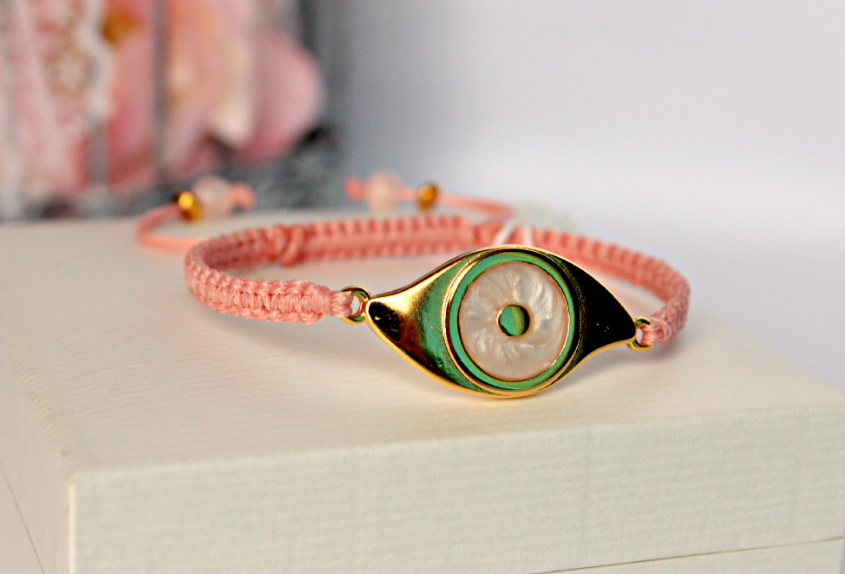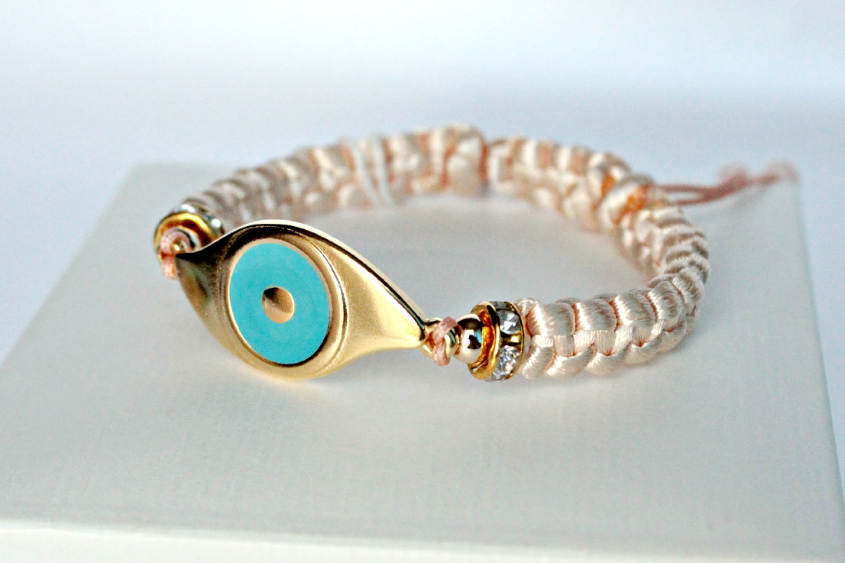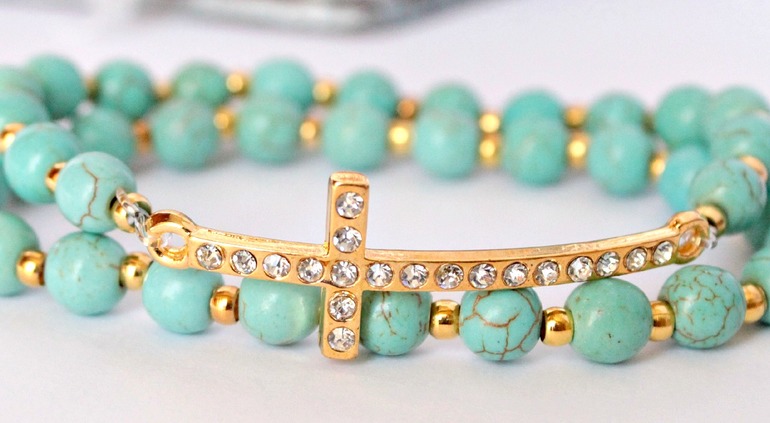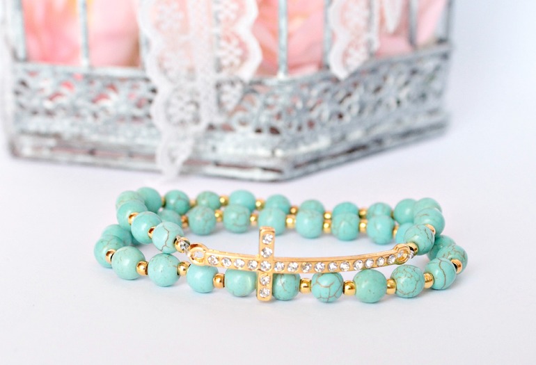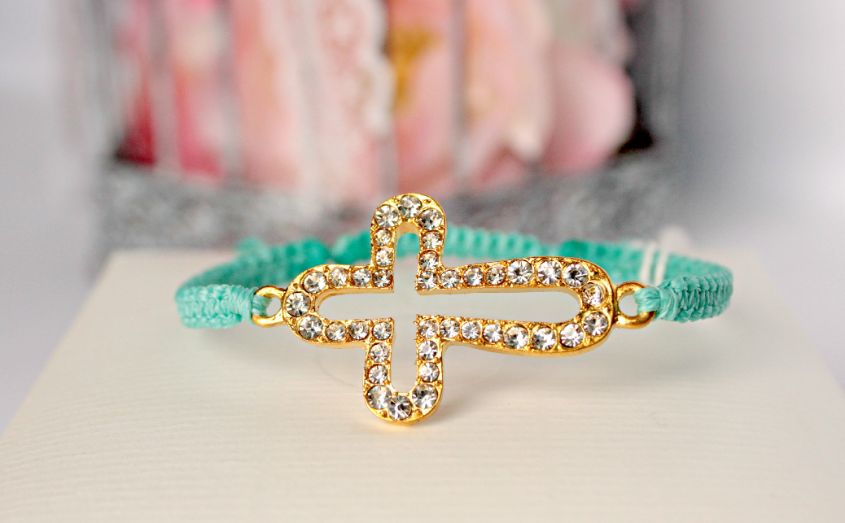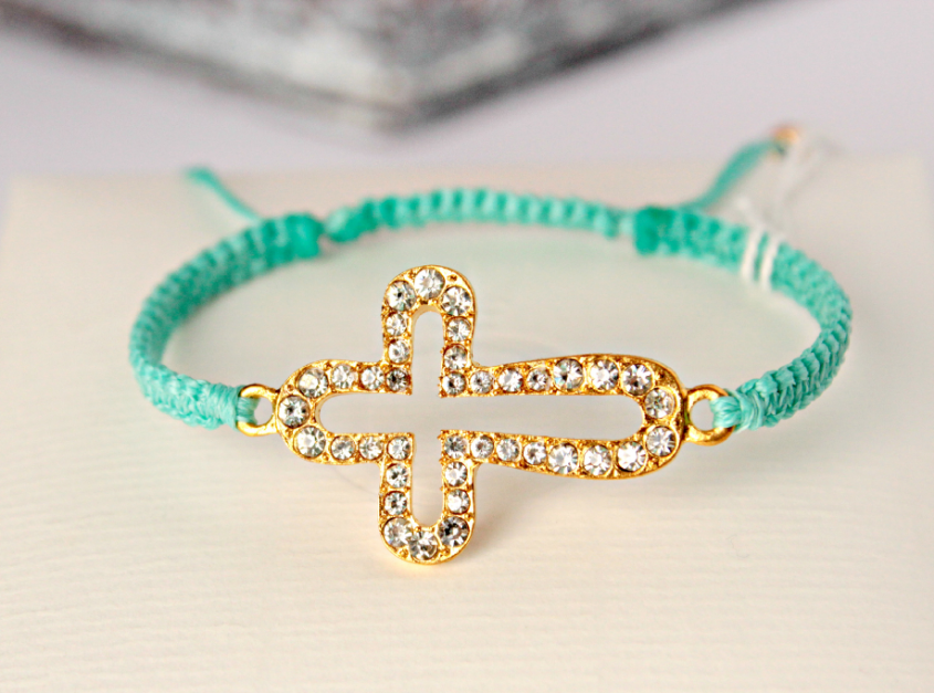 Бирюзовый браслет с крестом позолоченным- это макраме из воскового шнура